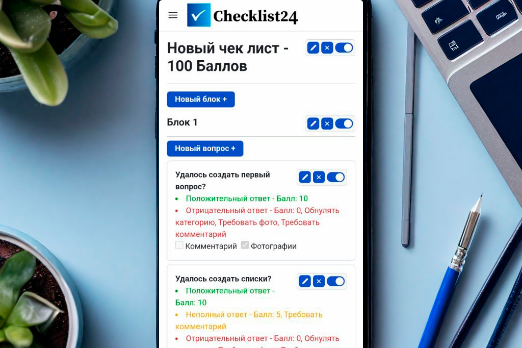 Checklist24 позволяет создавать чек-листы, адаптированные под ваши нужды, с разнообразными типами ответов для каждой задачи.